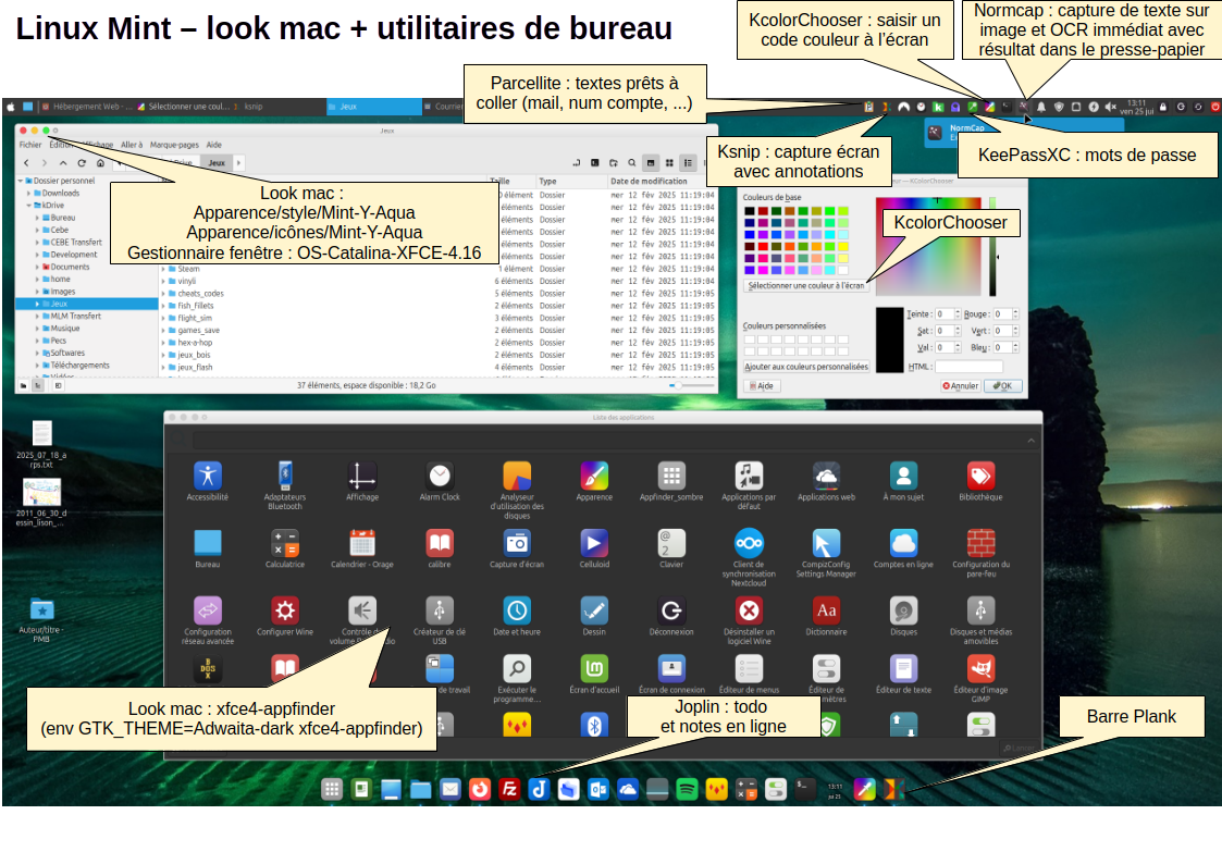 - Installer le thème OS-catalina-XFCE-4.16 pour avoir les boutons colorés de fenêtre en haut à gauche - Installer Appfinder pour le choix des applications - Installer Plank pour la barre d'applications en bas d'écran