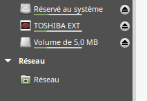 Quand vous insérez une clé USB ou connectez un disque externe, une fenêtre du navigateur Nemo s'ouvre et l'icône du périphérique s'affiche sur le bureau ainsi que dans les raccourcis, à gauche du navigateur.