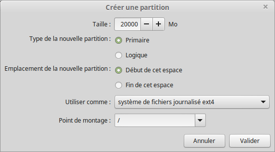 Une boîte de dialogue apparaît : nous allons créer la partition pour le système Ubuntu-Mint.