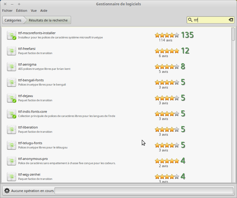Repérez la ligne proposant le logiciel souhaité et “Installer” à droite de la description. Le Système vous demande votre de passe et c'est parti !